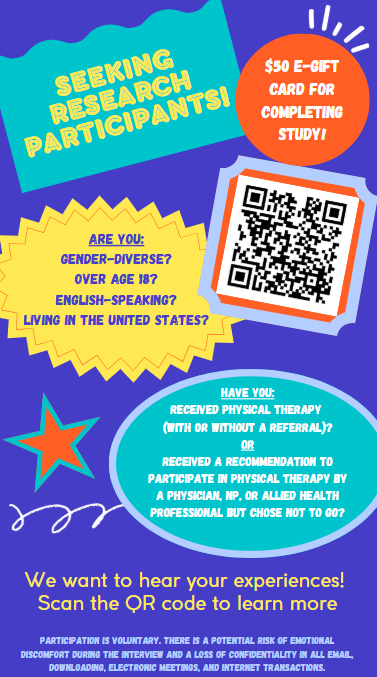 Researchers at Texas Woman's University, led by Dr. Elise Bjork, are currently recruiting participants for a one-hour virtual interview to better understand the experiences of gender-diverse people in accessing and receiving physical therapy care. For this study, the term gender-diverse refers to any person who does not conform totally to society’s norms for their assigned gender at birth and can include those who are transgender, non-binary, agender, genderqueer, or any other identity within that definition. Eligible participants should also be 18+ years old, currently living in the United States, and fluent in English. Participation in the study includes completion of a short anonymous digital demographic survey and a one-hour virtual interview with Dr. Bjork. Participants will receive a $50 gift card upon completion of the study. Participant safety is the top priority to the research team and numerous safety measures are in place, including the option for anonymity.