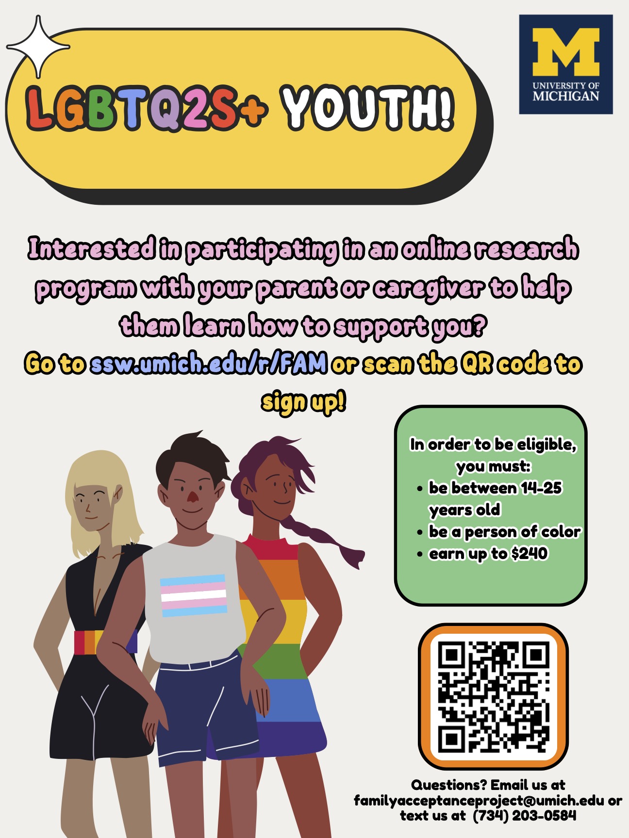 The Family Acceptance Project - Online is a 9 week online group program for LGBTQ+ youth of color (ages 14-25) and their caregivers / parents. The program is designed to help caregivers support their youth, while also providing opportunities for both youth and caregivers to receive peer support. Sessions involve educational components, interactive activities, group discussions, and support. Some sessions are with only other youth / caregivers, while other sessions bring youth and caregivers together. Caregivers are paid up to $260 for attending 9 sessions, and youth are paid up to $240 for attending 8 sessions.
