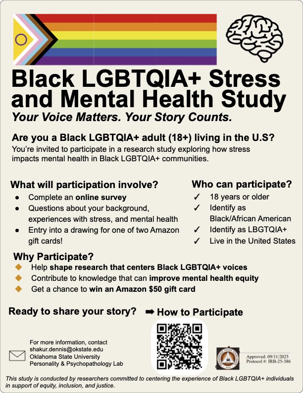We are delighted to invite you to participate in the Stress and Mental Health online study. This study explores the relationships between personality traits and stress among Black and LGBTQIA+ individuals.