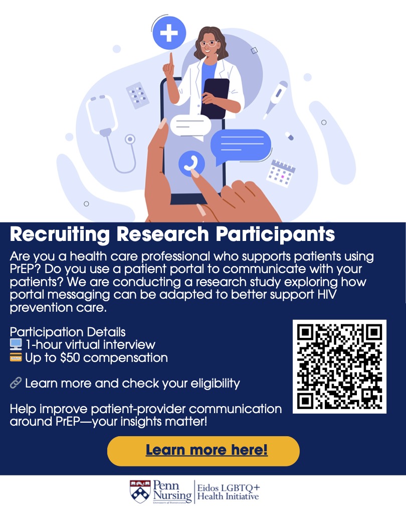 We are seeking healthcare providers to help us improve patient-provider messaging for HIV prevention! We are conducting a research study exploring how portal messaging can be adapted to better support Black and Latino gay, bi, and queer cisgender men’s use of PrEP, a pill or long-acting injectable that prevents HIV. You may be eligible if you are a healthcare provider, patient navigator, or care coordinator who supports PrEP uptake in a primary care setting.