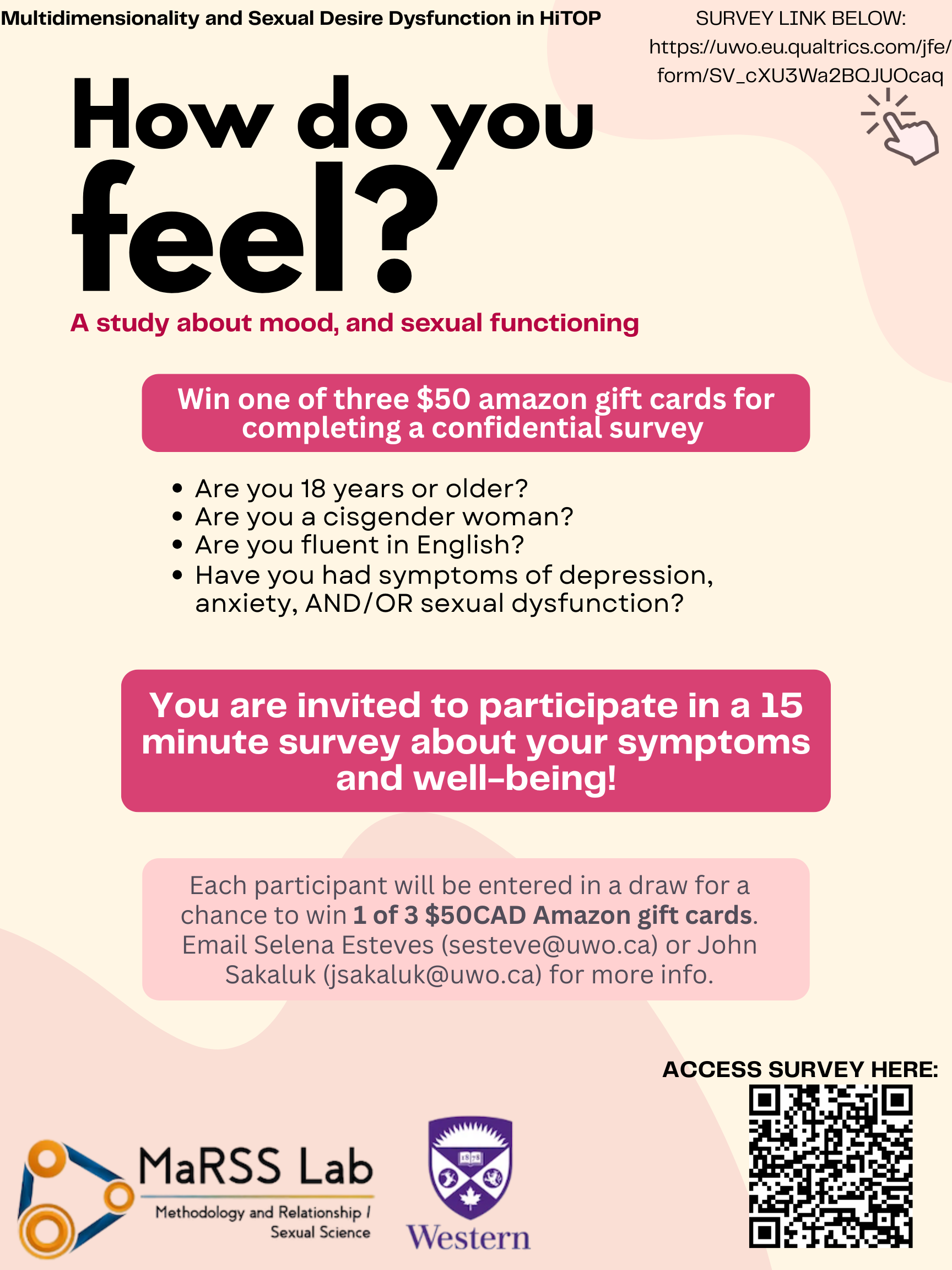 Want to help improve our understanding of how mental health symptoms overlap? Participate in an important research study on symptom and disorder comorbidity and overlap! This research team is looking for cisgender women (assigned female at birth) who are 18+ and have experienced symptoms of anxiety, depression, AND/OR sexual dysfunction (no diagnosis necessary) to complete a 15-minute survey for a chance to win 1 in 3 $50 Amazon gift cards! Your involvement can have a lasting impact on the treatment, diagnosis, and understanding of how sexual dysfunctions fit into our current understanding of mental health disorders.