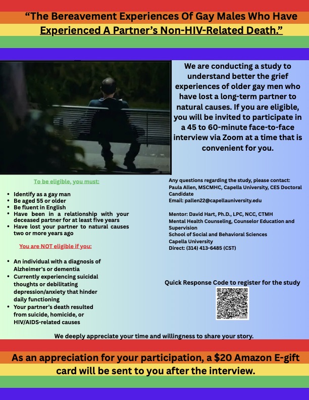My Name is Paula M. Allen. I am a Doctoral Candidate attending Capella University. I am working on a doctoral dissertation entitled "The bereavement experiences of older gay males 55 and older whose partner's death results from a non-HIV/AIDS-related event".