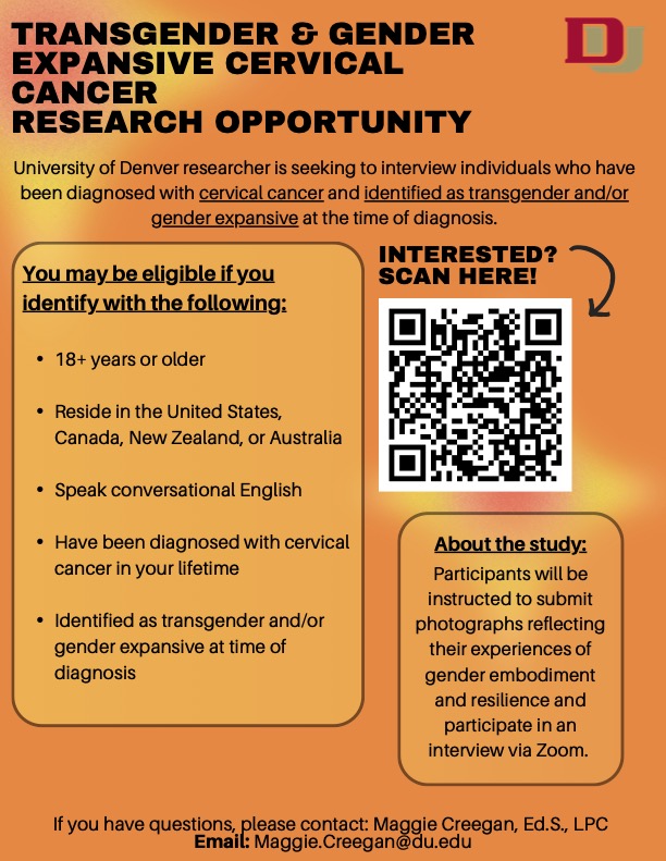 The purpose of this study is to explore the experiences of transgender and gender expansive (TGE) individuals who have been diagnosed with cervical cancer in their lifetime. Specifically, the study will examine the unique resilience factors associated with identifying as TGE that may provide support during the diagnostic and treatment process. This study will investigate how participants experience gender embodiment following diagnosis and assess the overall impact of the diagnosis on their mental health. Additionally, the study will utilize de-identified photographs submitted from the participants to answer the research questions and center their experience.