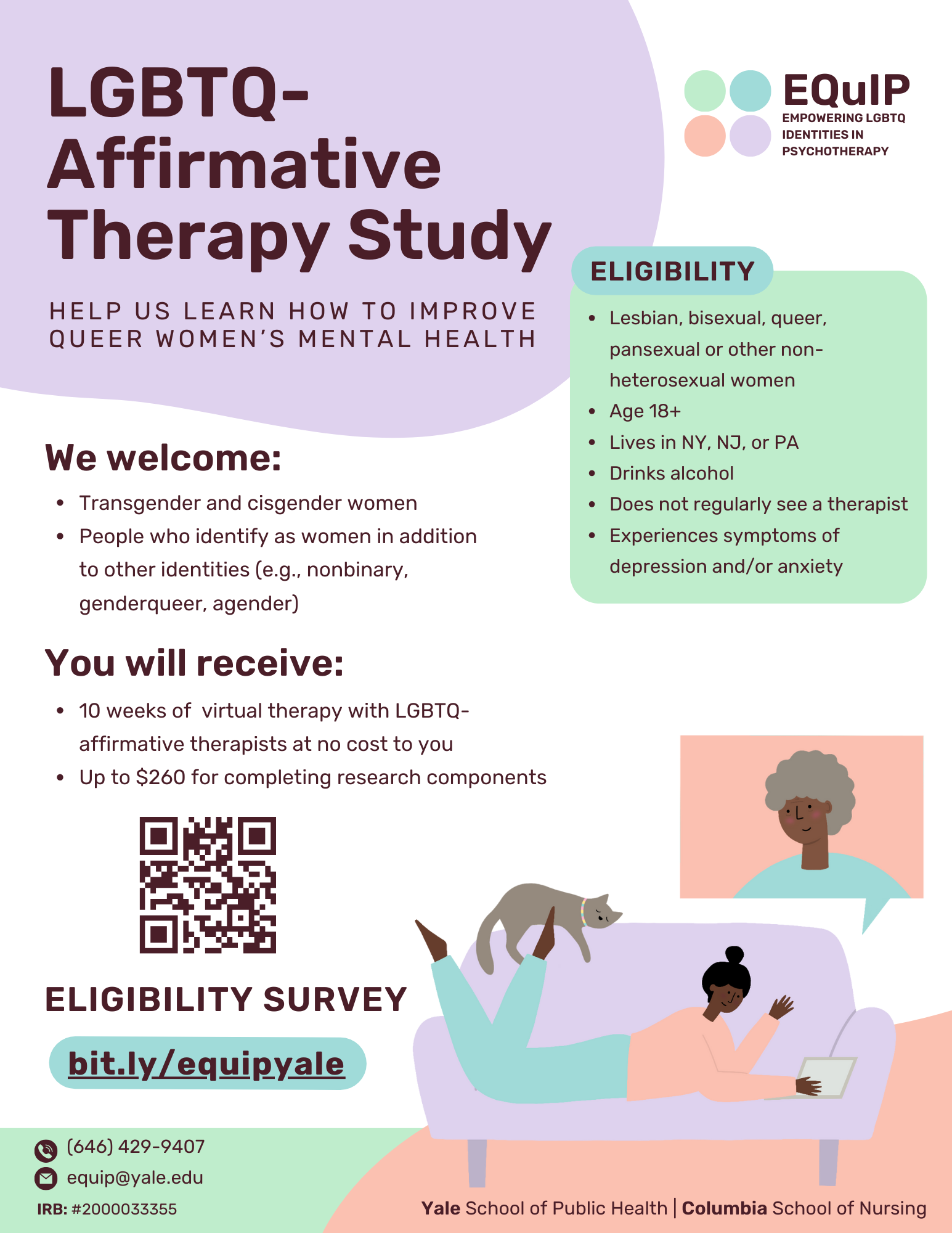 With Project EQuIP (Empowering Queer Identities in Psychotherapy) we aim to understand psychotherapy approaches work for queer women. Study participants will receive 10 sessions of LGBTQ-affirmative therapy and up to $260 for completing surveys and interviews about their experiences. We welcome transgender and cisgender women, as well people who identify as women in addition to other identities (e.g., nonbinary, genderqueer, agender).