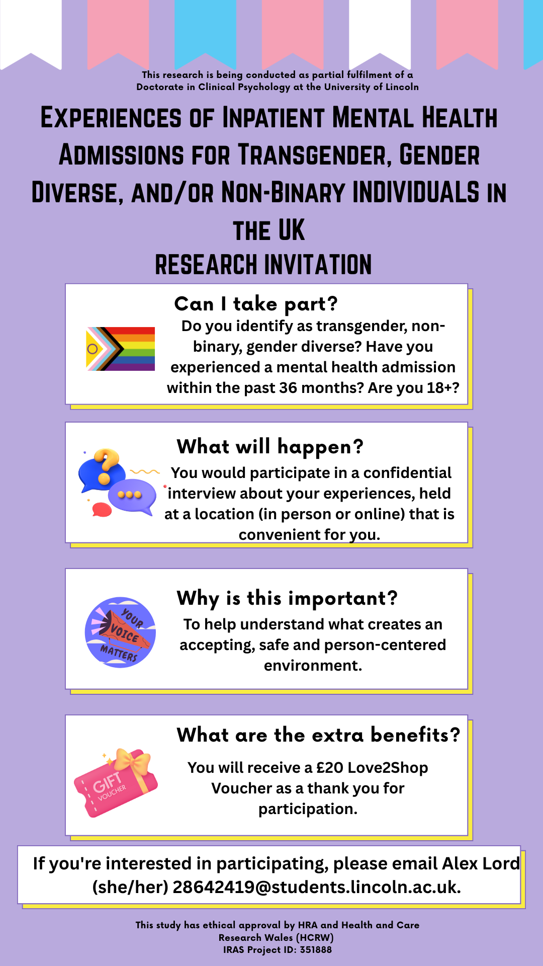 Experiences of admission within an inpatient mental health setting as someone who identifies as transgender, gender diverse and/or non-binary. You will be asked some questions about your gender identity and your experience of your inpatient admission. You will also be asked some questions about what was helpful and good about your experiences and what was less helpful and what may need improvement. This research aims to help improve mental health support in inpatient settings for transgender, gender diverse and/or non-binary individuals.