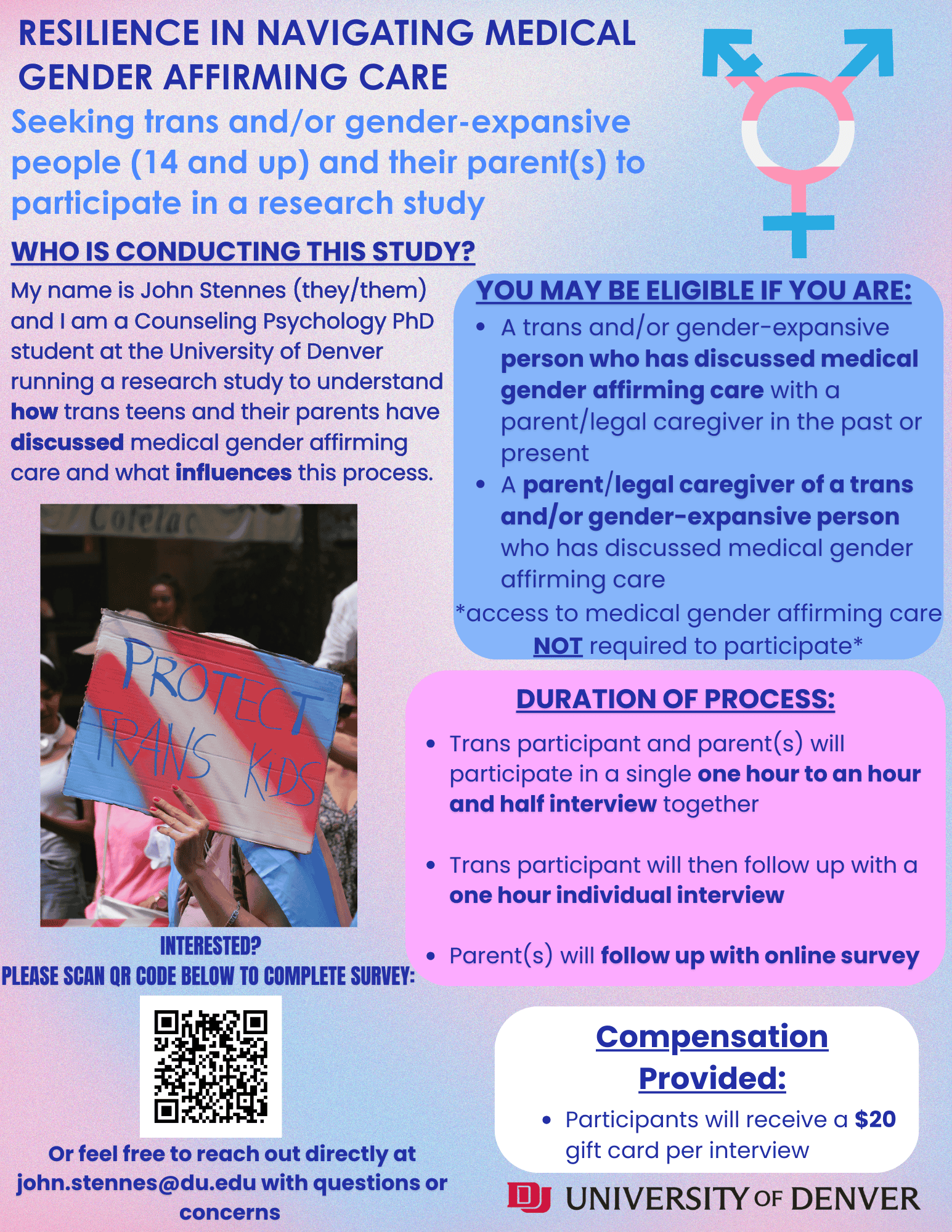 My dissertation is looking to better understand trans and gender-expansive (TGE) teens and their parents'/caregivers’ decision-making process related to medical transitioning. The purpose of the study is to better understand how TGE teens and their caregivers optimally navigate medical interventions, the social systems and structures that impacted these processes, and how mental health clinicians have supported discussions that relate to decision-making processes!