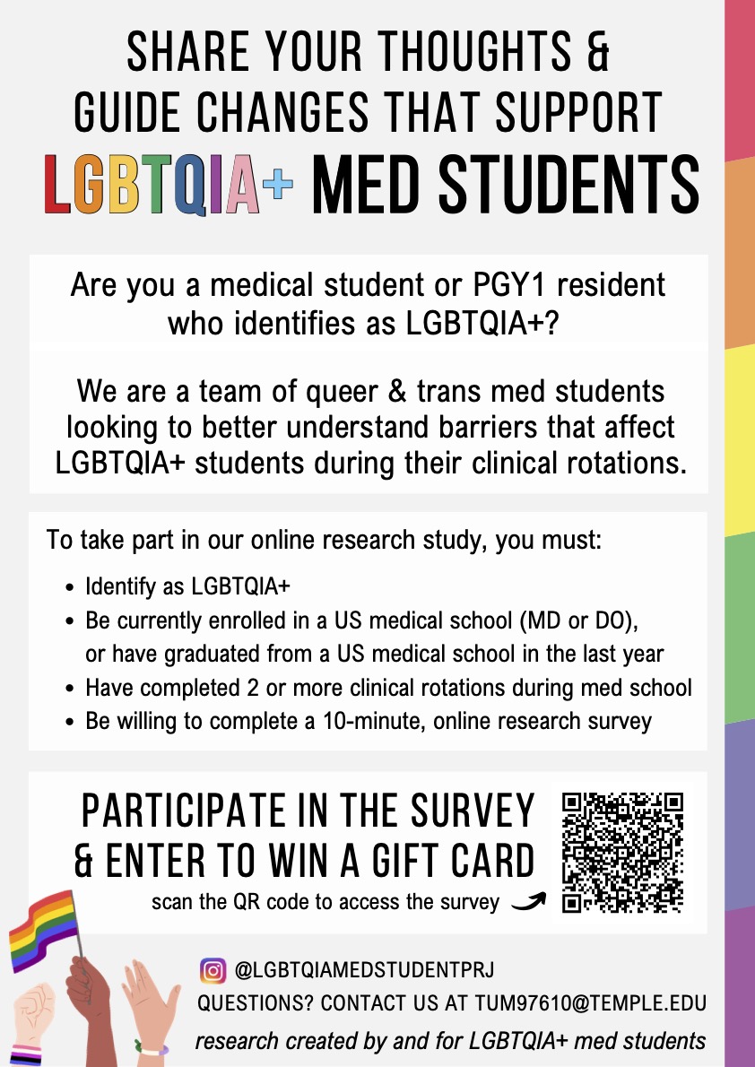 We are a group queer and trans medical students committed to understanding the unique experiences of LGBTQIA+ medical students during clinical rotations. In 2024, we conducted the largest study to date on LGBTQIA+ medical student experiences during the preclinical years and are currently working to publish these findings. Our next step is to explore experiences during clinical rotations. In today’s political climate, understanding how LGBTQIA+ students navigate hospital-based training, and how we can better support them, is more important than ever.