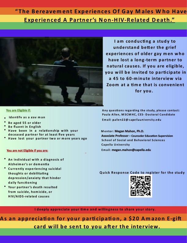 My Name is Paula M. Allen. I am a Doctoral Candidate attending Capella University. I am working on a doctoral dissertation entitled "The bereavement experiences of older gay males 55 and older whose partner's death results from a non-HIV/AIDS-related event".