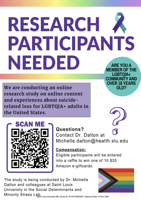 Hello, my name is Michelle Dalton, and I am a faculty member and researcher in the Social Determinants and Minority Stress lab in the Department of Family and Community Medicine at Saint Louis University. I am conducting an online study on the impact of different experiences LGBTQIA+ adults have regarding parasocial or online exposure to deaths by suicide to better understand how these deaths impact behaviors with the hope to improve mental health care.