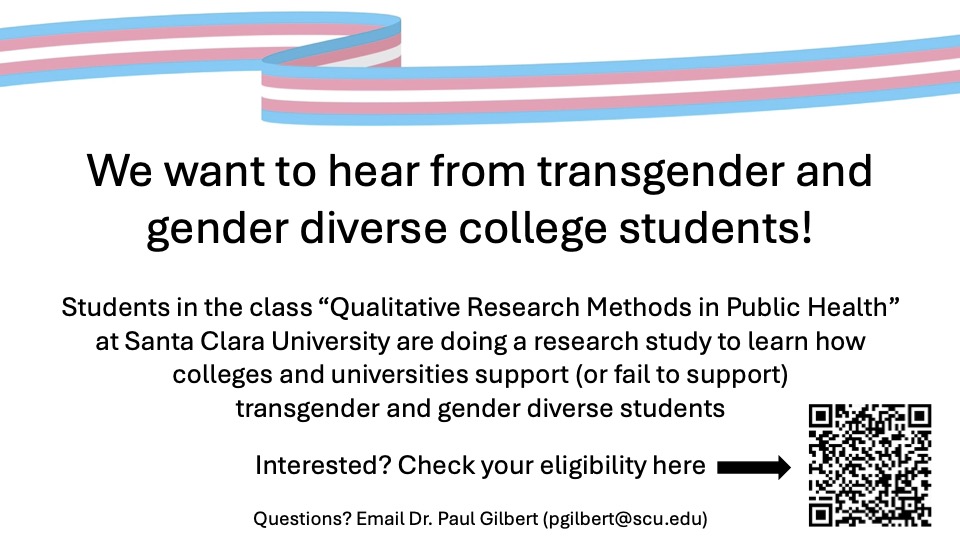 Students enrolled in the class “Qualitative Research Methods in Public Health” at Santa Clara University are recruiting transgender and gender diverse (TGD) peers to participate in individual interviews. Under the direction of Dr. Paul Gilbert, Associate Professor in the Department of Public Health, the class is undertaking a research project to learn how colleges and universities support—or fail to support—their TGD students. In addition, we would like to learn what TGD students are doing in response to recent social and political challenges. Each interview will take place on Zoom, and we anticipate it lasting 30-45 minutes. To be eligible to participate, folx must be age 18 years or older, currently enrolled in a college or university, and identify as transgender or gender diverse (i.e., not cisgender).