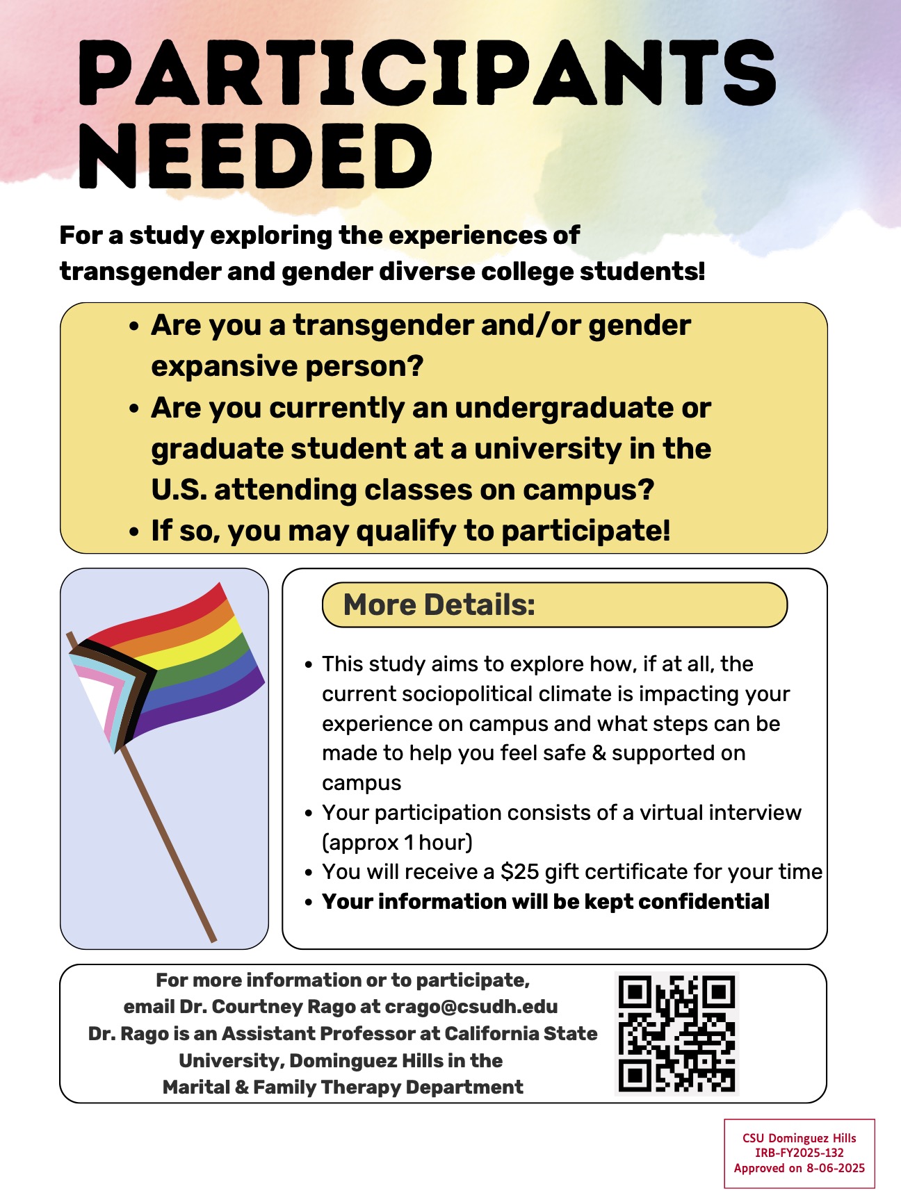 This is a qualitative study exploring the experiences of transgender and gender expansive (TGE) students attending college classes on-campus in the US. This project endeavors to elucidate the experiences of TGE students in the US at a time when TGE people are at increased risk due to ongoing policy changes and harmful rhetoric. Using semi-structured 60-minute interviews, the study aims to understand the impact of political discourse and legislation on TGE College Students and seeks to gain insight into ways to increase the experience of safety for TGE college students on campus, centering intersectional and social safety frameworks.