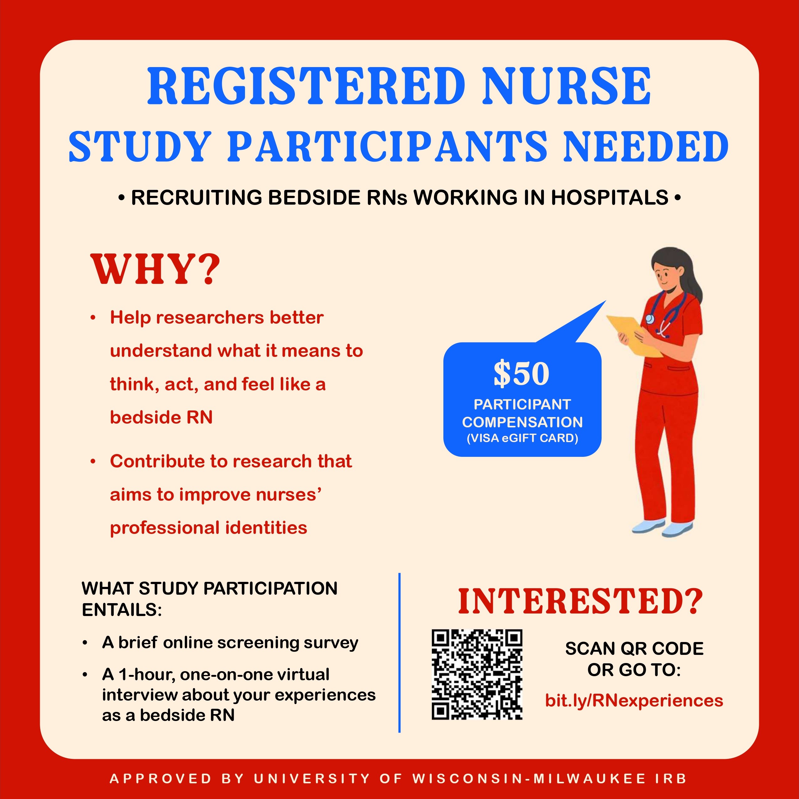 We will conduct virtual one-on-one interviews with each participant about their experiences as a direct care RN. The interview will include questions about their career path, employer, coworkers, managers, and what being a nurse means to them. We will also ask some demographic questions to learn more about the participant and about their workplace. The total time will be about 60–90 minutes.
