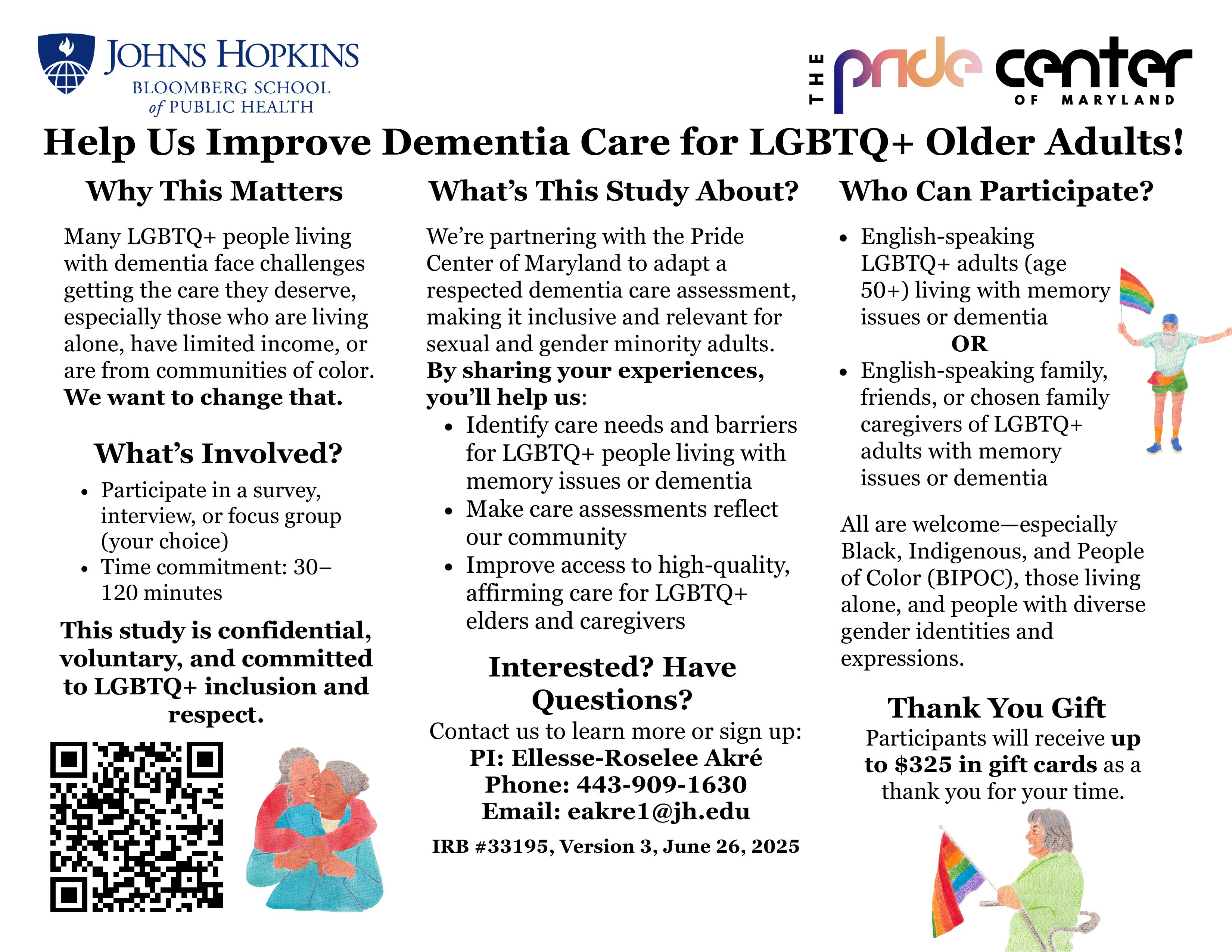 This study aims to improve access to high-quality, affirming care for LGBTQ+ elders and their caregivers by providing recommendations to update current dementia care needs assessments used by healthcare providers. These assessments help providers understand the needs of people living with dementia and their caregivers. Current assessments do not capture the unique needs and barriers faced by LGBTQ+ patients living with dementia and their caregiver. This study's outcomes will help care assessments reflect the lives and strengths of our community.