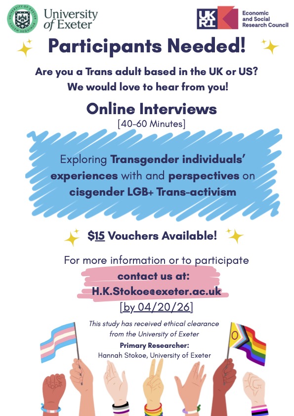 Researchers from the University of Exeter would love to hear from you! Online interviews (40-60 minutes) exploring Transgender individuals’ experiences with and perspectives on cisgender LGB+ Trans-activism. £15 vouchers available!